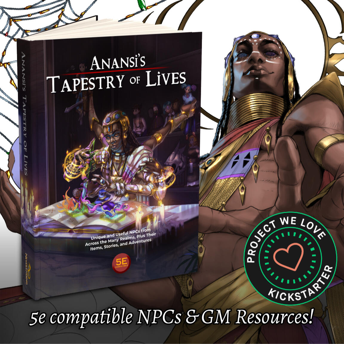 Anansi's Tapestry of Lives populates your tabletop roleplaying game world, so you can focus on the fun and your story.You and your players are going to love every one of the 110 richly detailed NPCs, 40+ magic items, 20+ side quests, and 70 detailed locations.490 pages of content in two books! Plus voice acted intro monologues, tarot sized NPC cards, VTT tokens & more!Get all these tools at a discount by preordering on exclusively Backerkit today!