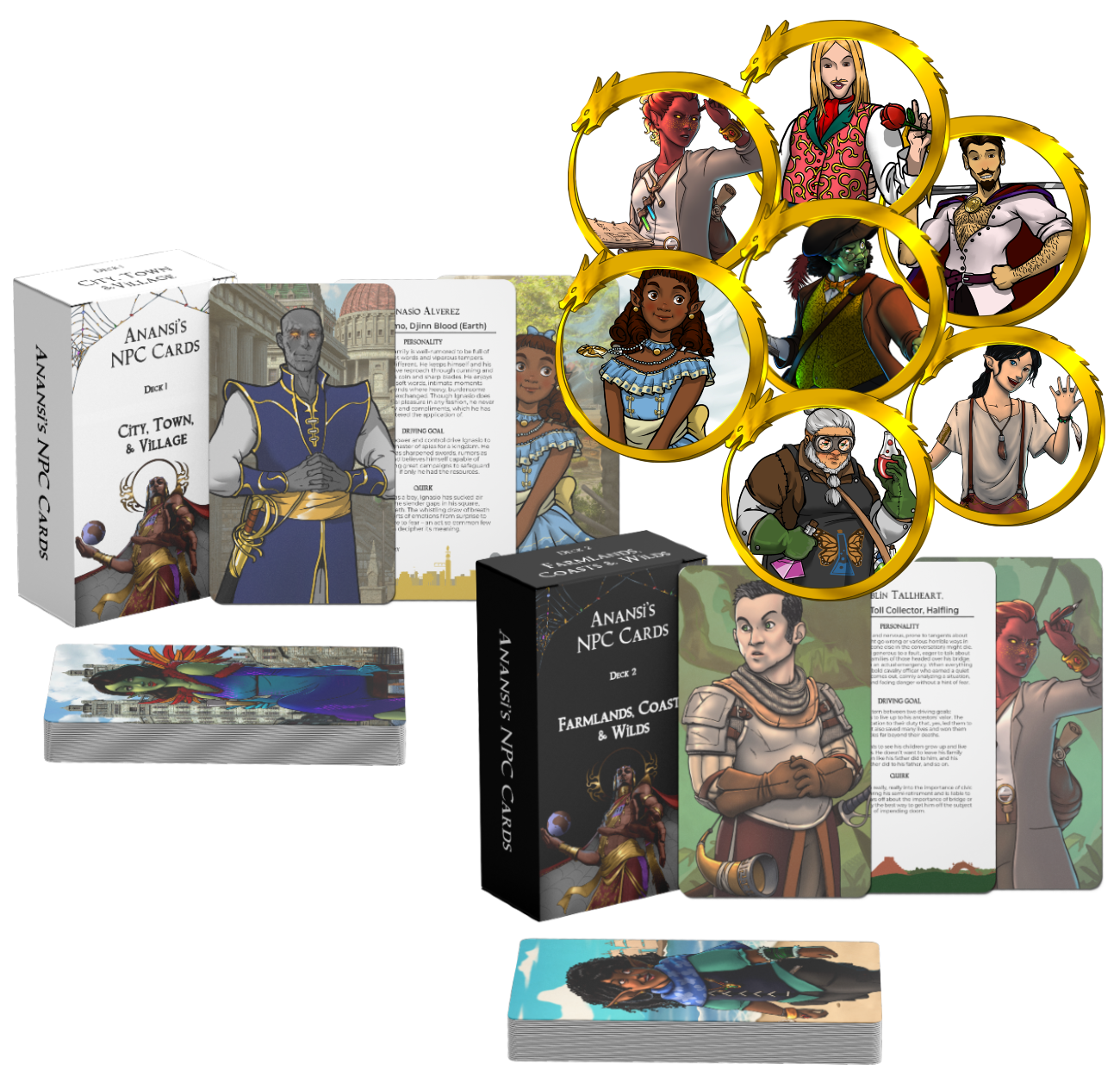 Over 1,300 players, DMs, and GMs just like you helped us fund the creation of Anansi's Tapestry of Lives, Anansi's Journal of Common Places, and the other awesome tools (like NPC cards). While we finish producing this massive book, you can get in on the discount!Now that the project has been funded, you have a chance to get these books at the same Huge Discount that our early supporters on Kickstarter enjoyed. Don't miss out. Preorder today to get all this loot at a big savings!