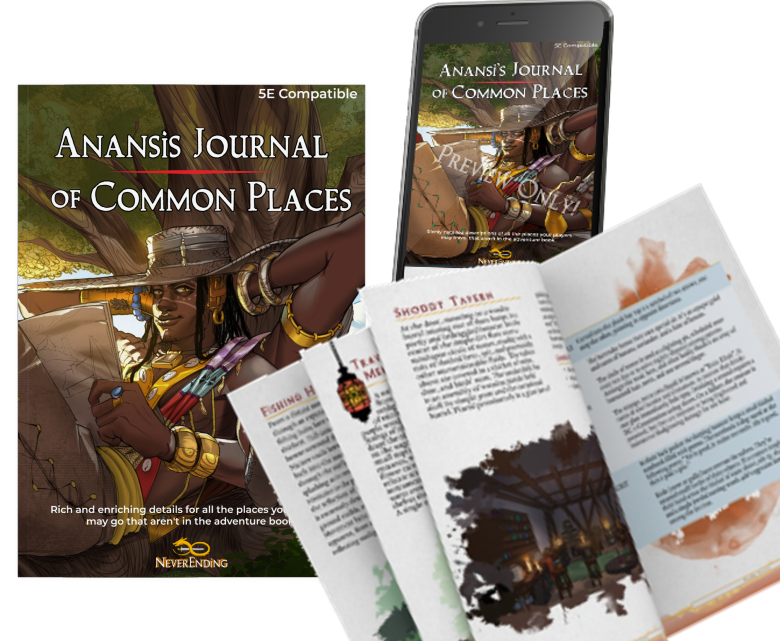 No more scrambling to make up interesting descriptions on the fly. In Anansi's Journal of Common Places, you'll discover 140+ pages of details for common locations like a room in a fine inn, a rundown stable, an herbalist shop, and more.Each location has text that can be read aloud. There's also searchable secrets that you can reveal if and when your players search the area.